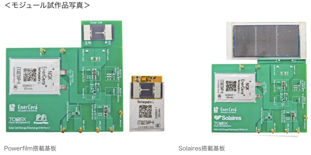 同モジュールは、日本ガイシのリチウムイオン二次電池「EnerCera」と、トレックス・セミコンダクターの超低消費電源IC、そしてペロブスカイト太陽電池などの次世代太陽電池を組み合わせたもの。用途として、ウエアラブルデバイス、IoTエッジデバイス、工場やオフィスにおける室内環境モニタなどを見込む。