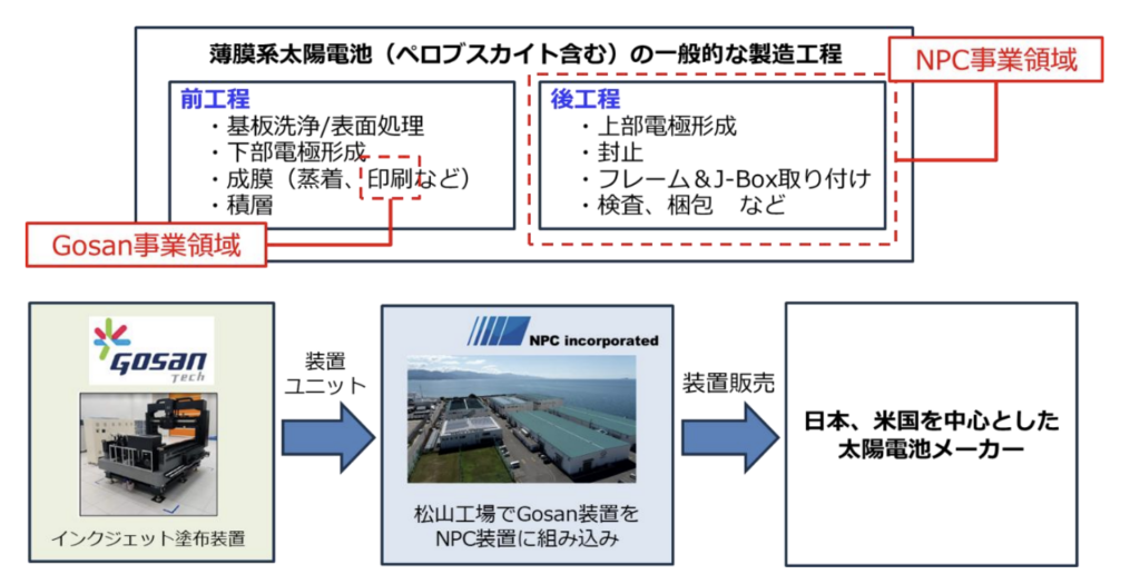 提携先のGosanは、有機ELディスプレイ製造で培った高精度なインク供給・圧力制御技術を強みとする。2025年にはセイコーエプソンからも出資を受けており、同社のプリントヘッドを組み込んで強溶剤への対応を実現している。NPCの松山工場でこれらの装置を統合することで、スタートアップ企業であるGosan単独では対応が困難であった大規模な製造ラインの設計・構築が可能となる。