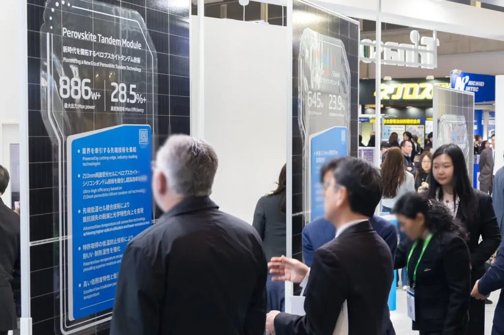 トリナ・ソーラーは、東京ビッグサイトで2026年3月17~19日にかけて開催された「PV EXPO 2026」で、産業用の標準量産サイズをベースとした最新のタンデムセル搭載モジュールを展示した。
