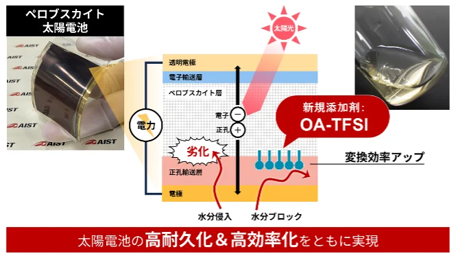 産業技術総合研究所(産総研)グループは、ペロブスカイト太陽電池のエネルギー変換効率と耐久性を同時に向上させる新材料「OA-TFSI」を開発したと、2026年2月2日に発...